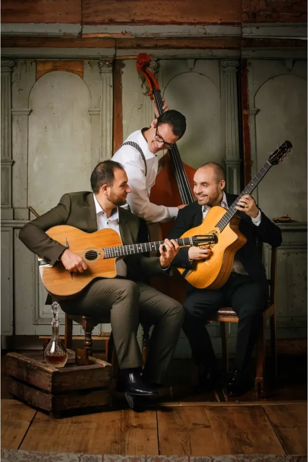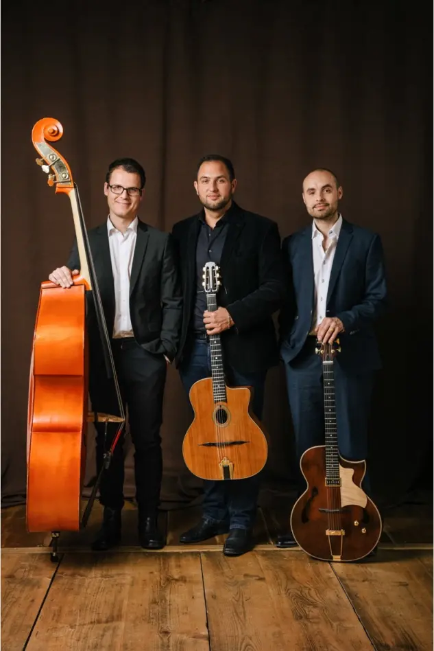 Das Trio hat sich mit ihrem Debutalbum „Storyteller“ und mit zahlreichen Konzerten einen Namen in der internationalen Gypsy Jazz-Szene gemacht. Sologitarrist und Kontrabassist begeisterten 2019 mit Stargeiger Sandro Roy und dem Münchner Rundfunkorchester im ausverkauften Münchner Prinzregententheater.