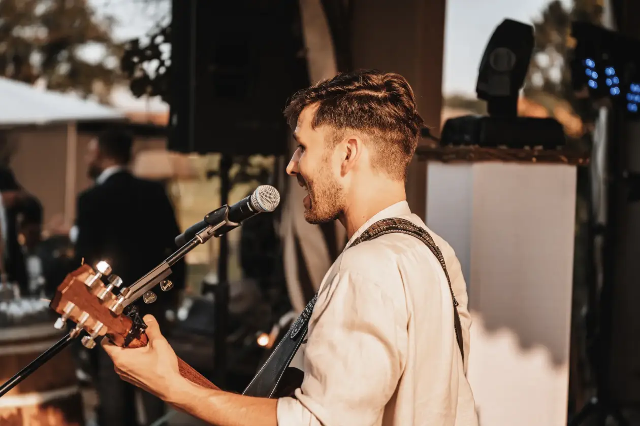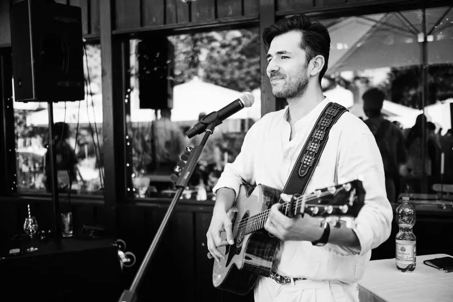Hi ich bin Kim Loy. Wunderbar von eurer geplanten Hochzeit zu hören. Glückwünsche gehen raus. Die Kombination aus Livemusik und DJ-Performance ist gelungene Unterhaltung und der Garant für eine herausragende Hochzeitsfeier. Von mir bekommt ihr beides. Ich bin Hochzeitssänger und DJ mit jahrelanger Erfahrung von nahezu 100 Hochzeiten, professioneller Audio-Anlage und Lichttechnik um eure Hochzeit zu einem individuellen und unvergesslichen Tag in eurem Leben zu gestalten. Ich begleite eure Feier musikalisch von Anfang an bis zum krönenden Abschluss. Während eurer Trauung singe ich eure Lieblingslieder, untermalt mit meiner Akustikgitarre. Daraufhin, bei eurem Sektempfang, unterhalte ich eure Gäste mit angenehmer Livemusik. Nach dem Abendessen performe ich für euch leidenschaftlich mit ausdrucksstarker Stimme, dynamischer Akustikgitarre, jeder Menge Liveprogramm und treibendem Rhythmus meiner Stompbox. So ersetze ich alleine effektiv fast eine komplette Partyband. Ich biete euch anschließend meinen erstklassigen DJ-Service und rocke die Turntables für euch und eure Hochzeitsgesellschaft. Kollektives Abtanzen garantiert, Open End, Entertainment pur. Die Momente ohne Livemusik z.b. während eures Dinners, versüße ich euch mit harmonischer und unterhaltsamer Hintergrundmusik vom Tonträger.