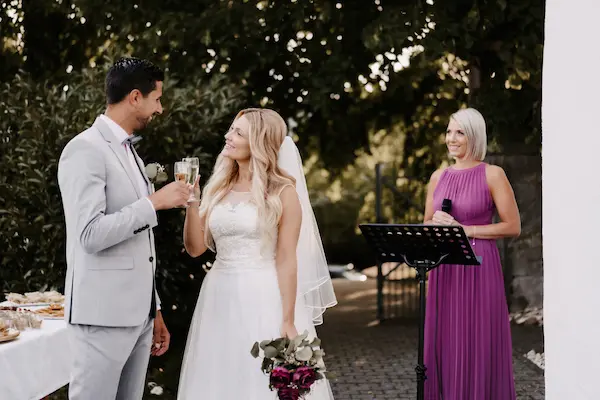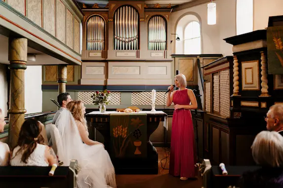 Wir haben Lisa als sehr empathische, liebevolle und zuverlässige Person kennengelernt. Sie hat sich innerhalb weniger Stunden auf unsere Anfrage gemeldet und nach kurzer Zeit haben wir einen Videocall zum Kennenlernen vereinbart. Wir haben uns direkt super wohl mit ihr gefühlt und es war als würden wir mit einer sehr guten Freundin sprechen. Es gab direkt eine schöne Harmonie und Verbundenheit. Lisa hat uns außerdem detailliert erklärt wie der Ablauf ist, wie wir am besten bei der Songauswahl vorgehen und hat uns mit ihrer langjährigen Erfahrung sehr gut beraten. Bei Fragen war sie immer ansprechbar für uns und hat sich auch gemeldet, um einfach nachzufragen, ob wir noch Hilfe benötigen und wie sie uns unterstützen kann. Ein paar Tage vor der Trauung sind wir telefonisch ein paar wichtige Dinge durchgegangen und Lisa hat sich sogar nach unserem Kleidermotto erkundigt, was wir sehr schön fanden. Am Tag der Trauung haben wir sie endlich auch persönlich kennengelernt und es war genauso herzlich wie wir es bereits im Videocall wahrgenommen haben. Sie ist mit genügend Vorbereitungszeit in unserer Location eingetroffen, um in Ruhe ihren Soundcheck machen zu können. Lisa hat unsere persönlichen Lieder wunderschön gesungen und alle hatten Gänsehaut! Sie ruft mit ihrem tollen Gesang so viele Emotionen hervor und das ist etwas ganz Besonderes! Beim Sektempfang hat Lisa sehr passende Lieder gewählt, sodass es zur Situation aber auch zu unseren Gästen passt. Unsere Gäste und wir waren bzw. sind begeistert von Lisa – sowohl von ihr als Mensch als auch von ihrem Gesang!